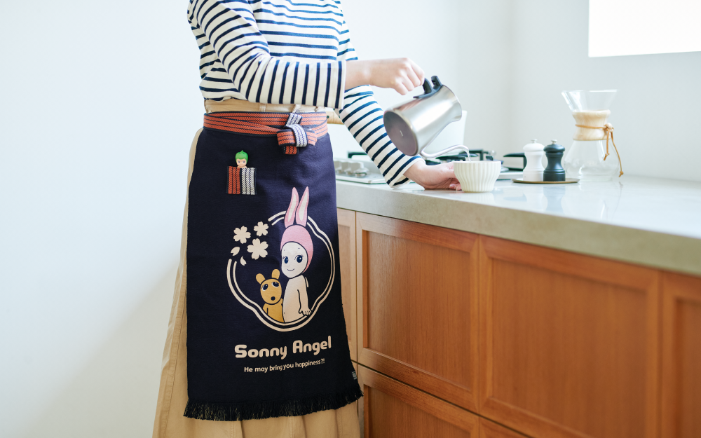 Sonny Angel has collaborated with “Anything”, Japan’s only specialist maekake apron brand still using shuttle looms over 100 years old. Maekake aprons offer practical benefits like supporting the lower back and protection while cooking. These traditional aprons have been gaining popularity overseas as a stylish work accessory.